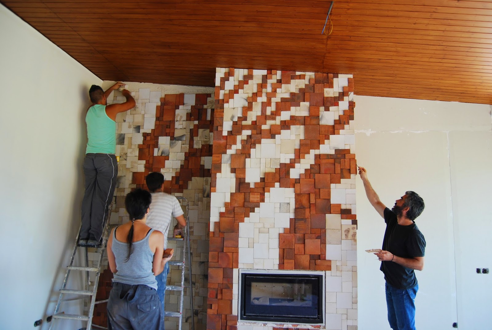 Depois de muito trabalho, com tantas peças pequenas e pequeninas, quadrados e rectângulos de diferentes medidas e cores, lá conseguimos colocar tudo na parede conforme o pretendido (ou quase, uma vez que acho sempre que se pode melhorar). O Sr. Monteiro foi sempre dando incentivo e soluções para os pequenos problemas que iam surgindo, o Filipe e o Joaquim lá se foram adaptando ao trabalho moroso que lhes tocou colocar na parede e eu ia sempre orientando, uma vez que de 5 em 5 minutos o trabalho na parede não correspondia ao desenho. O Gil ainda deu uma mão nos acabamentos para melhorar o trabalho.Trabalhoso para todos, mas o resultado final justificou. Agora é só terminarem a obra da casa para os clientes poderem usufruir.