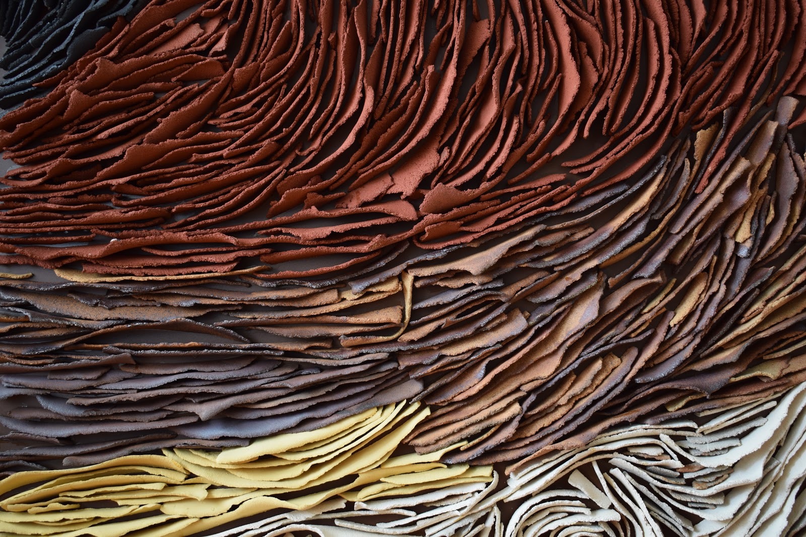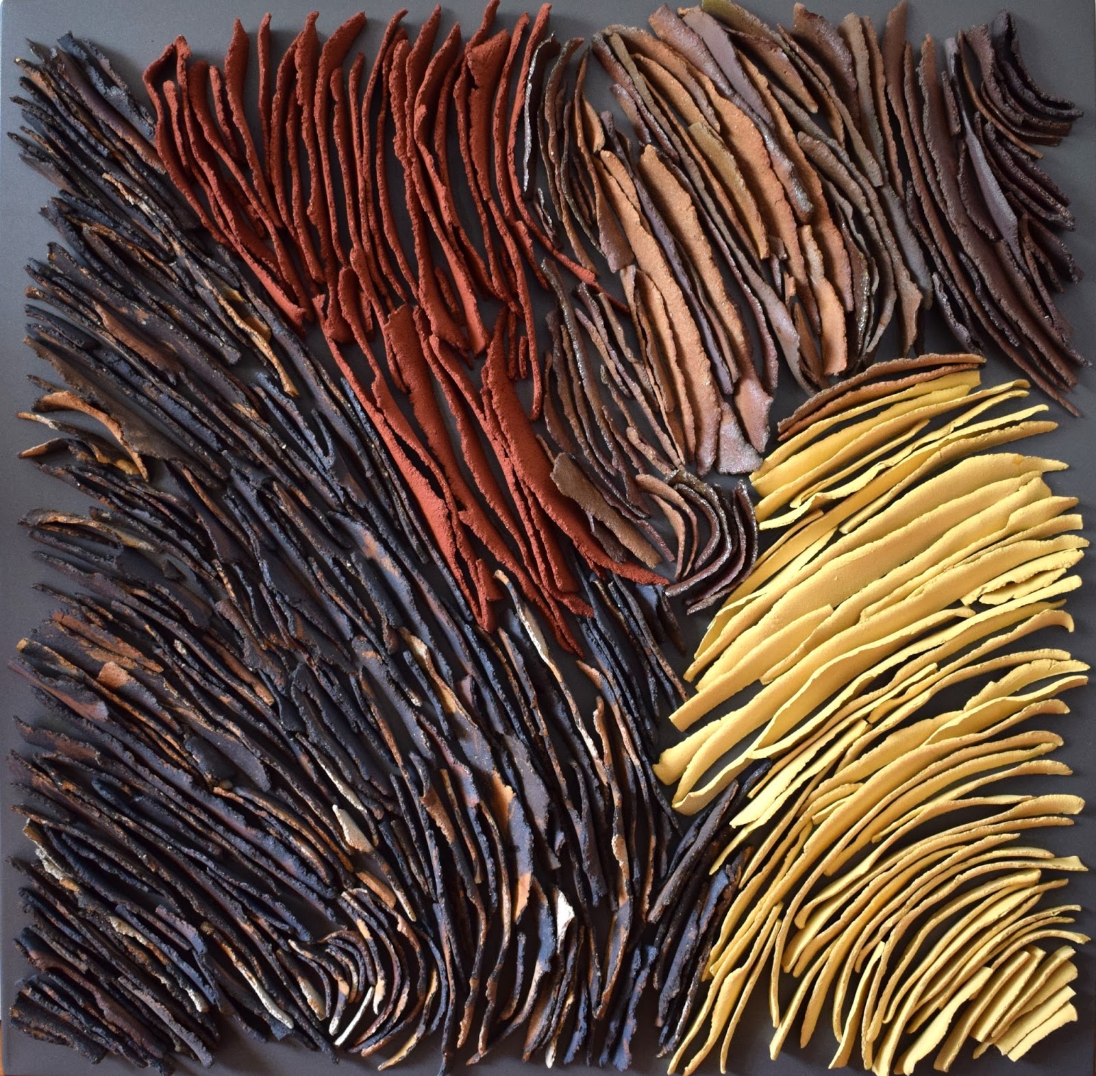 Grês de várias cores sobre alumínio, técnica da lastra, cozedura a 1200ºC em forno de lenha. 80 x 80 x 7 cm. 2018.