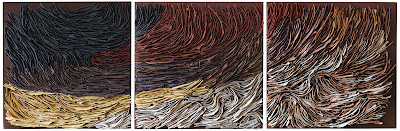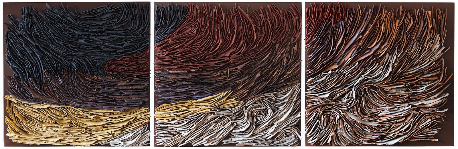Como en otras ocasiones, Sofia Beça utiliza la estructura de un tríptico. Son tres cuadrados. Su secuencia crea una panorámica. Los cuadrados hablan de reposo. Su secuencia habla de movimiento. La estrategia de los colores invita a la vista a recorrer el tríptico de izquierda a derecha, y partiendo desde abajo, donde encuentra un amarillo que impulsa a una masa de blanco o de blancos metamorfoseantes que, como si sufrieran una presión tectónica se desbordan en el último cuadrado, y lo llenan, ascendiendo, mientras se contaminan de azules de cielo y rojos de fuego y pretender retornar, sin conseguirlo, desde la esquina superior derecha, en sentido inverso, empujando, eso sí, una lengua rojiza que embiste al negro violentamente. Ese negro que parecía, al comienzo, el simple fondo bajo el que latía aquel primer amarillo, se demuestra ahora una fuerza viva. Porque todo fluye en esta obra, tan específicamente cerámica, y tan cerca de la pintura, por otro lado, donde las lajas de gres, que son una herramienta muy particular de la artista, funcionan como pinceladas, como quantums de fuerza, con una vida propia. El título mismo plantea una paradoja. Las sedimentaciones son sólo una imagen de un tumultuoso, pero lentísimo movimiento, ajeno al tiempo de los hombres, pero real, al contrario de las vanidades del mundo.